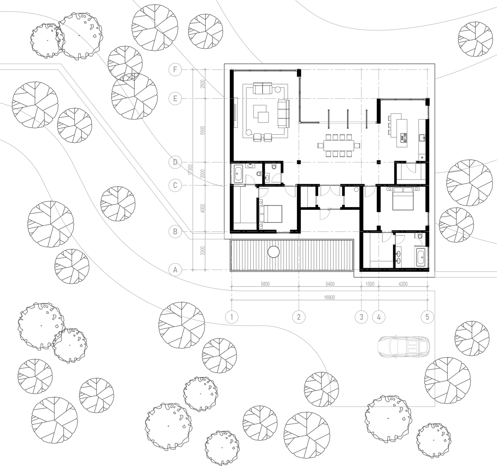В доме расположились все необходимые помещения: столовая по центру, объединяющая зону кухни и место для релакса - гостиную. Все эти комнаты имеют выход на террасу с шикарным видом на сосновый лес и озеро вдали. Две спальни со своими ванными и гардеробами обеспечивают максимальную приватность и качественный здоровый сон.